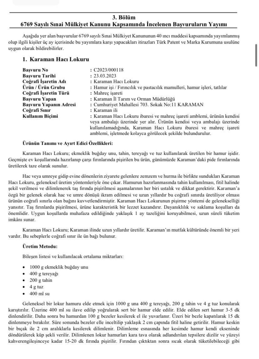 Karaman İl Tarım ve Orman Müdürlüğü tarafından 23 Mart 2023 tarihinde Coğrafi İşaret başvurusu yapılan “Karaman Hacı Lokuru”, 17 Kasım 2025 tarihli ve 209 sayılı Coğrafi İşaret ve Geleneksel Ürün Adı Bülteninde yayımlanarak resmen tescil edildi. Böylece Karaman’ın coğrafi işaret alan ürün sayısı 15’e yükseldi.