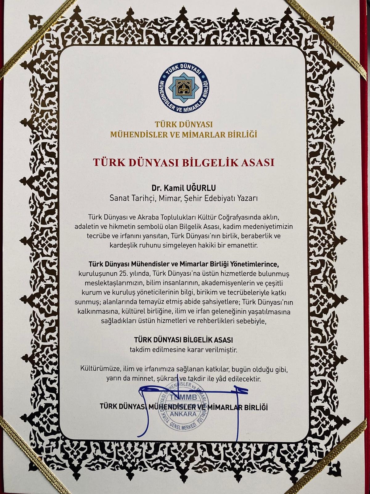 Türk Dünyası Mimarlar ve Mühendisler Birliği (TDMMB) tarafından verilen Türk Dünyası Bilgelik Asası bu yıl mimar Kamil Uğurlu’ya takdim edildi. TDMMB’nin kuruluşunun 25. yılı dolayısıyla düzenlenen ödül programı, İstanbul’daki Bozdağ Film Platoları’nda gerçekleştirildi.